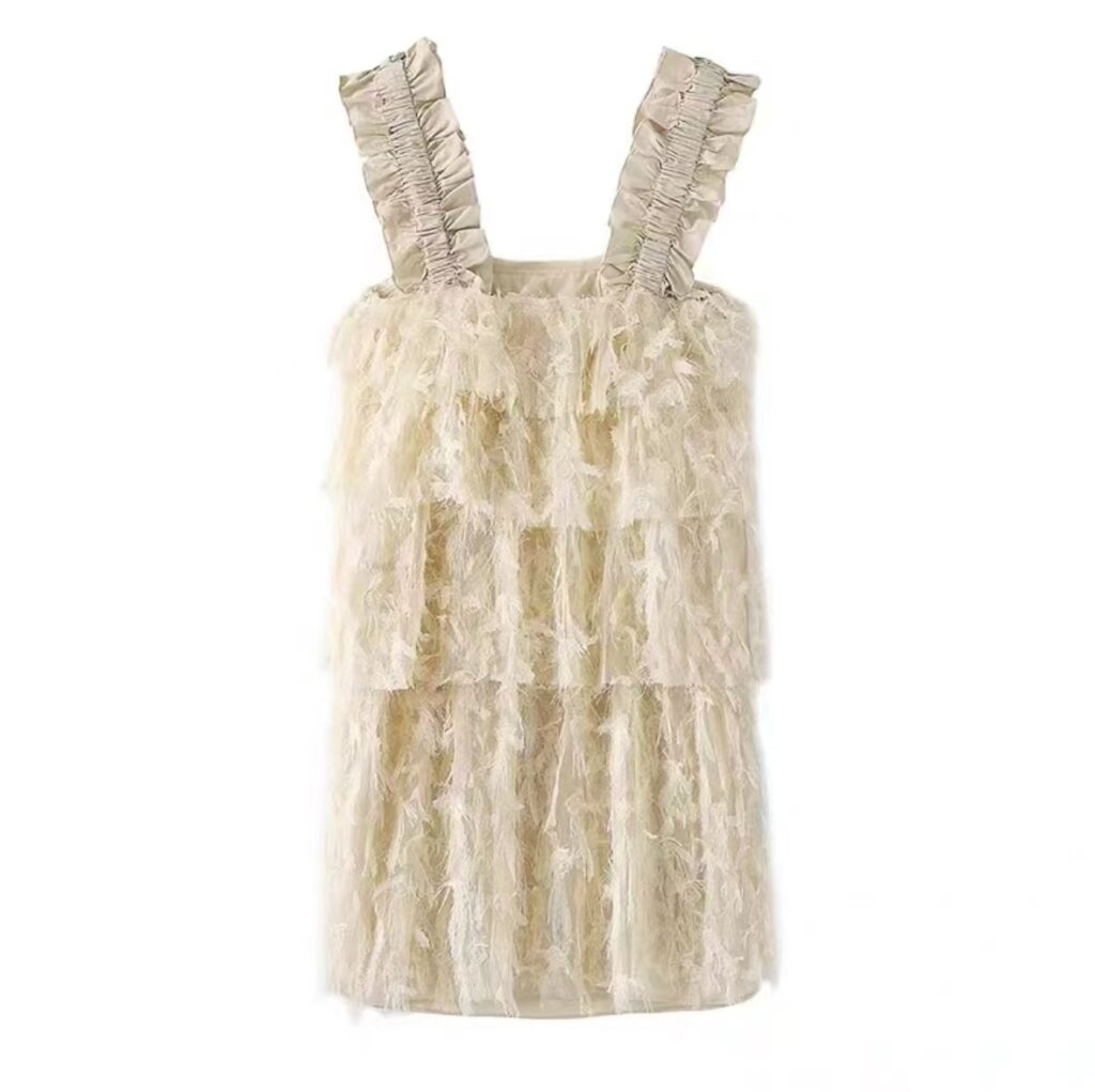 Blusa beige con capas de encaje y tirantes fruncidos, ideal para un look romántico y sofisticado en ocasiones especiales.