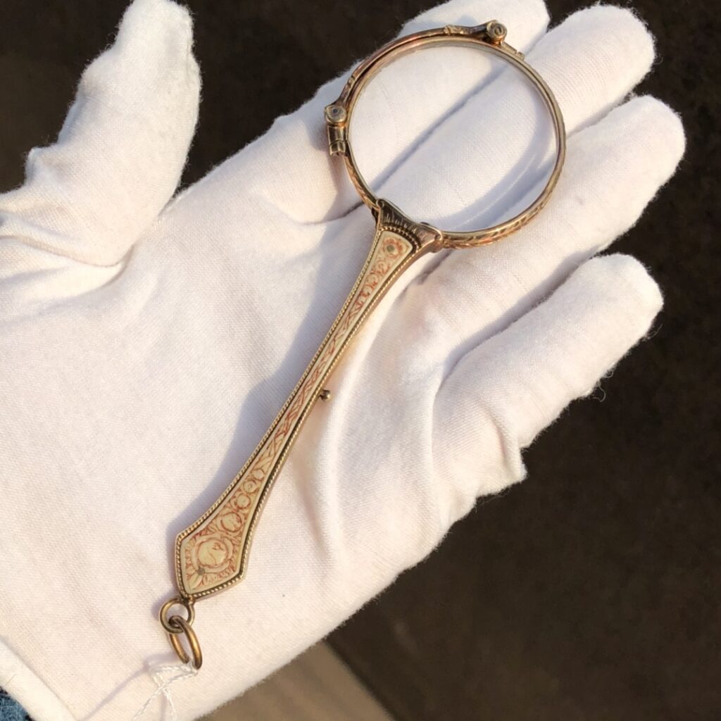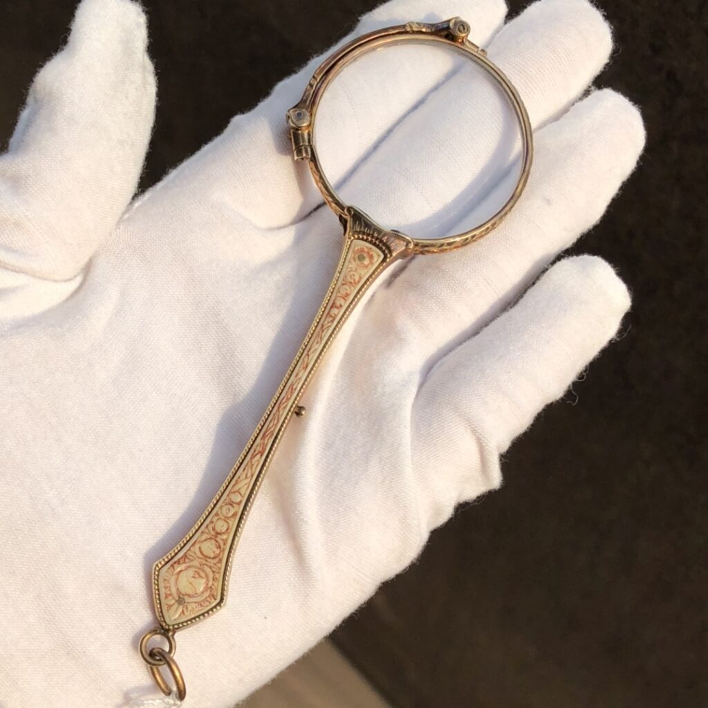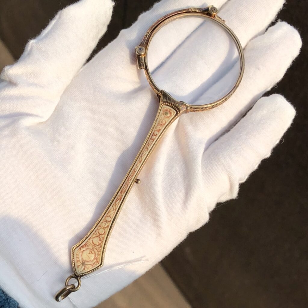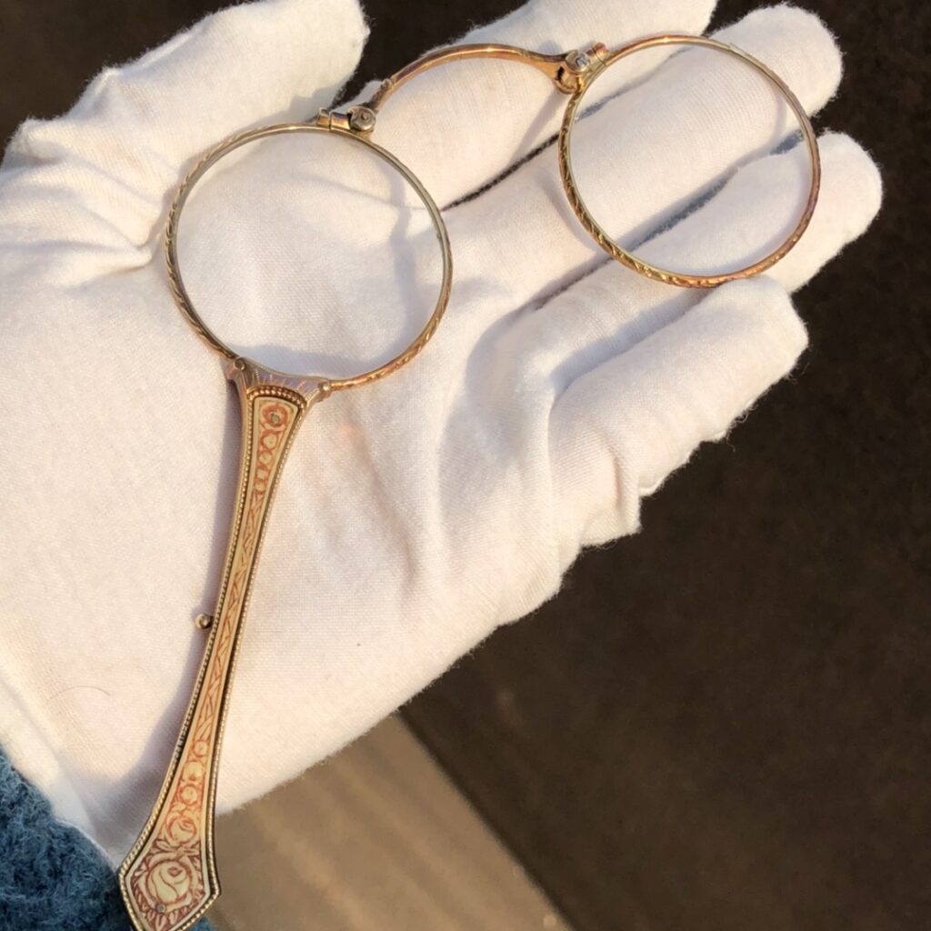 旧的14k实心金带花釉折叠镜片- 19世纪