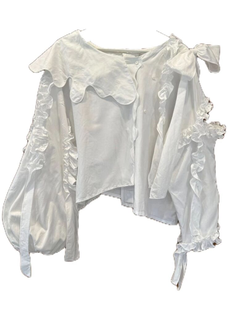 白色衬衫有褶边和丰满的袖子,是浪漫和复杂外观的理想选择。