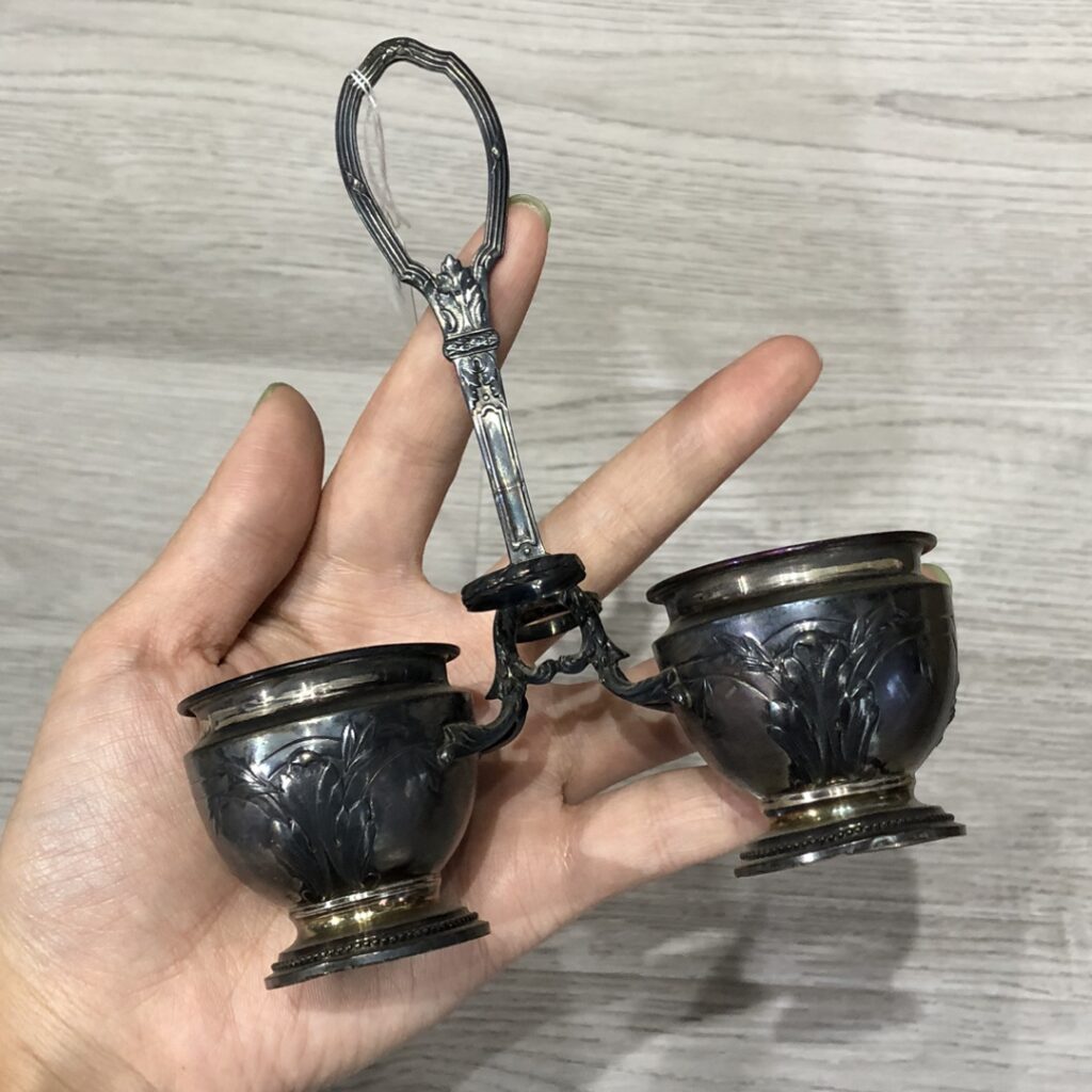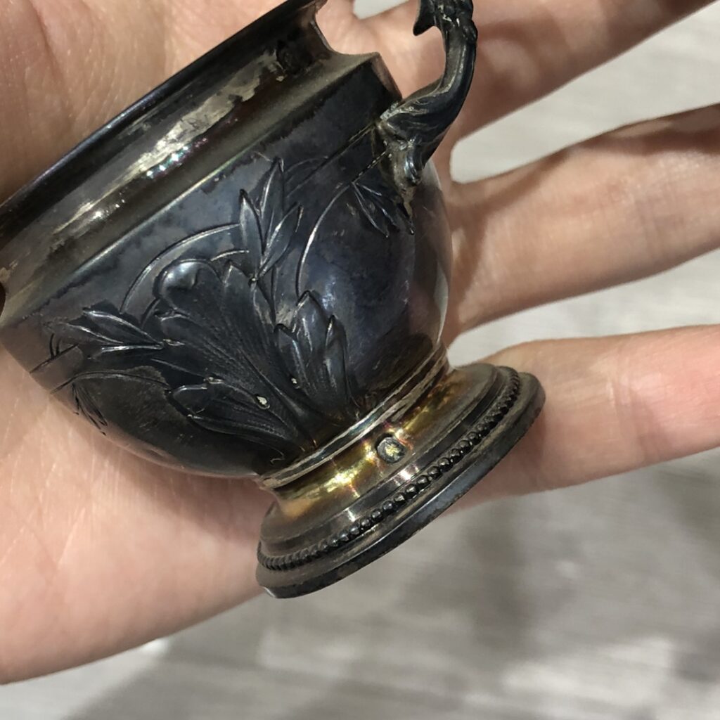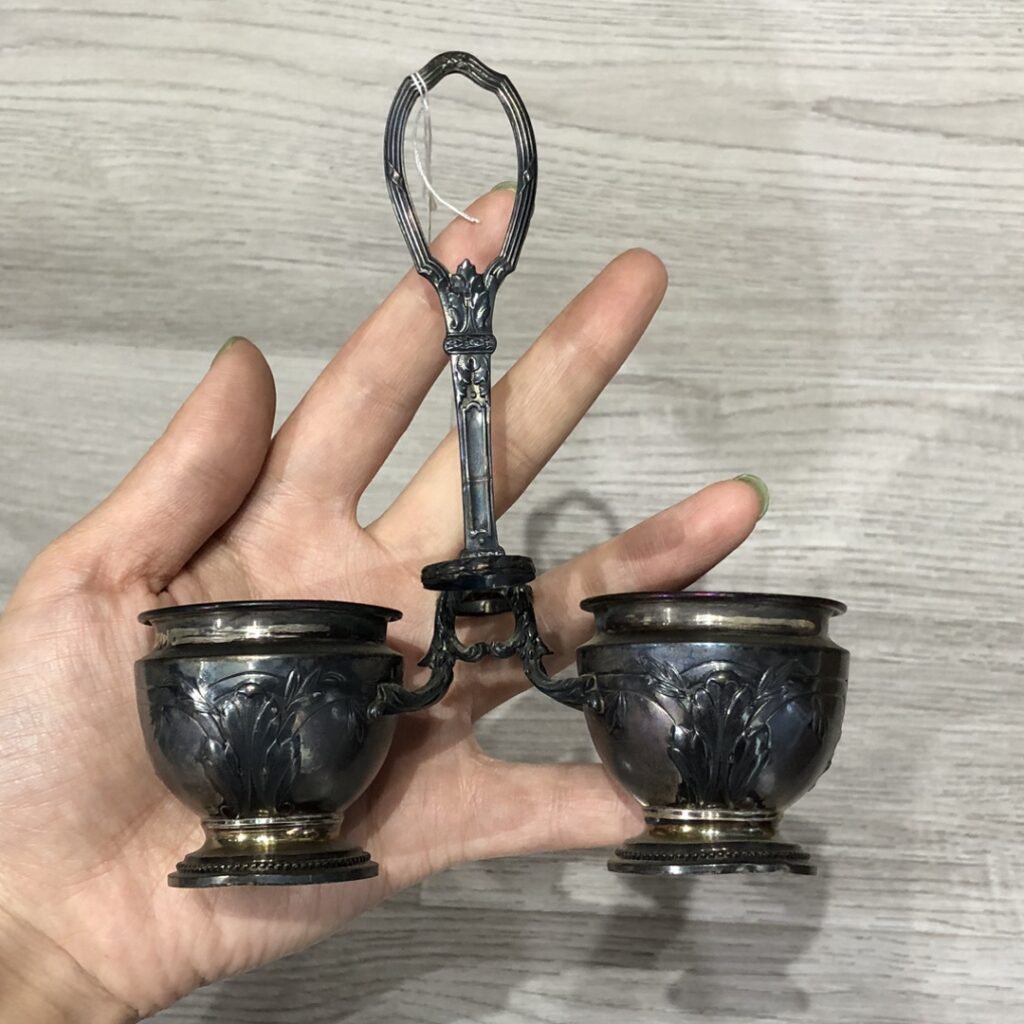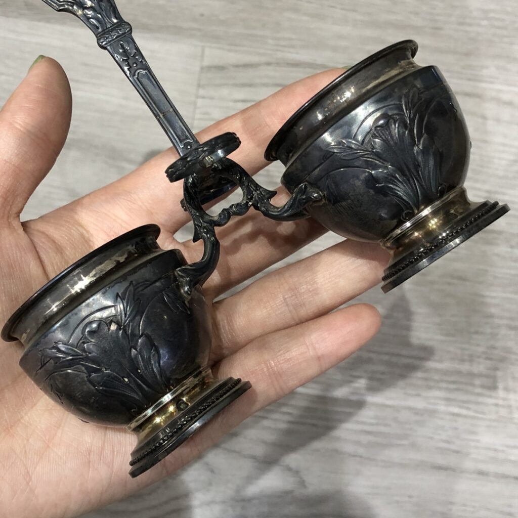 一套古董银杯与浮雕设计和金色完成在内部。重量88克,尺寸约14.5厘米高,12厘米宽。适合收藏家或作为豪华装饰。